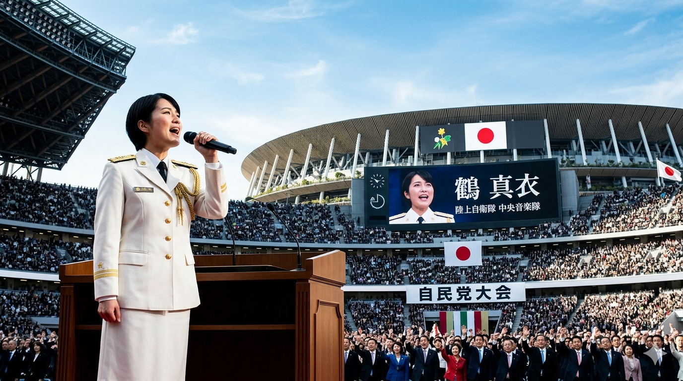 2026年4月12日、自民党大会のステージに一人の女性自衛官が登場し、その圧倒的な歌声で会場を包み込みました。「陸上自衛隊が誇るソプラノ歌手」として紹介された彼女の名は、鶫真衣(つぐみ まい)3等陸曹。