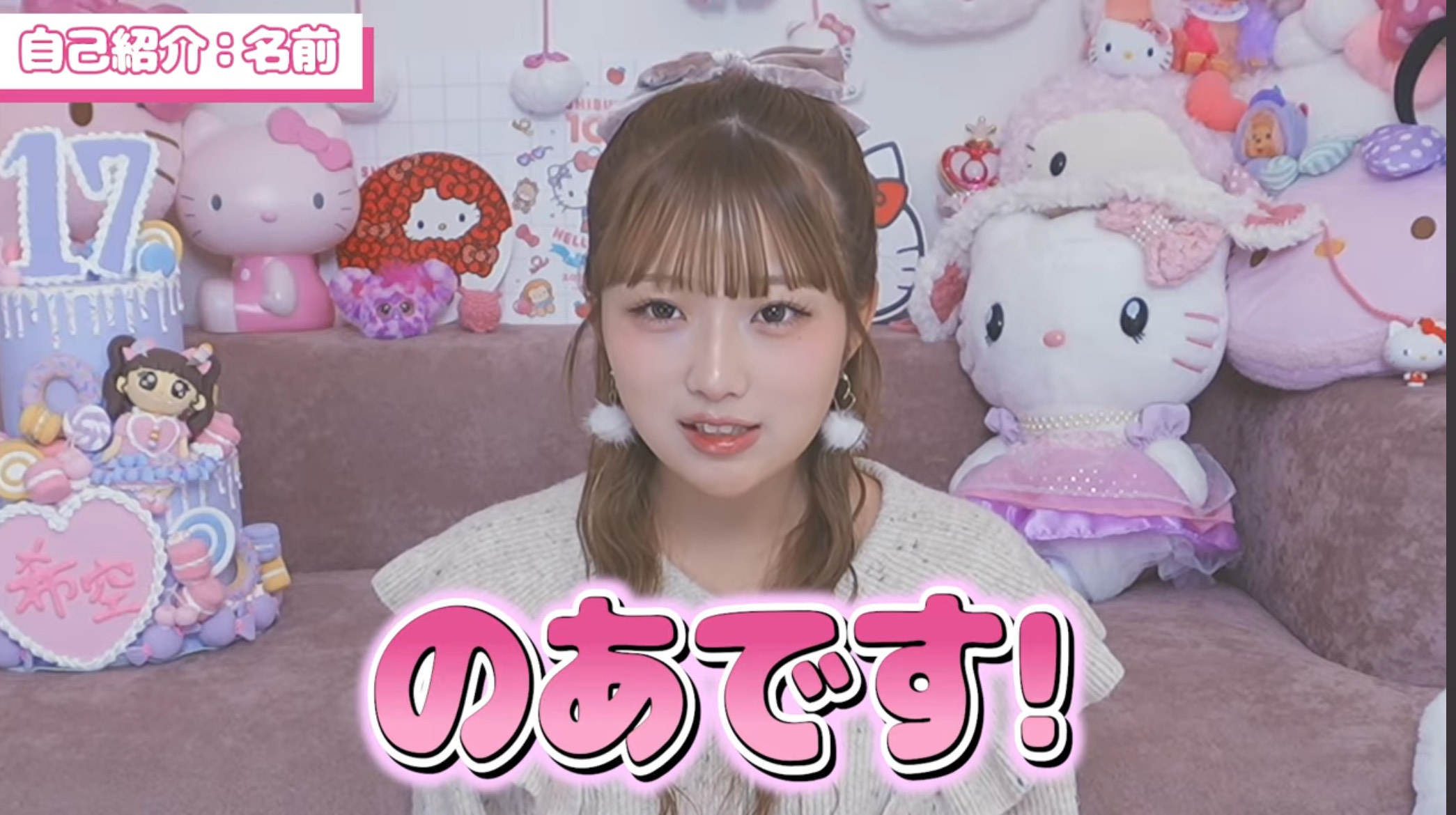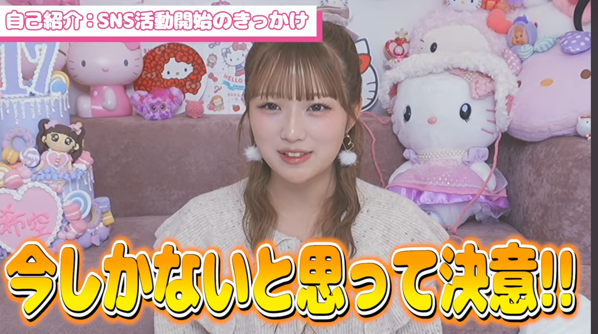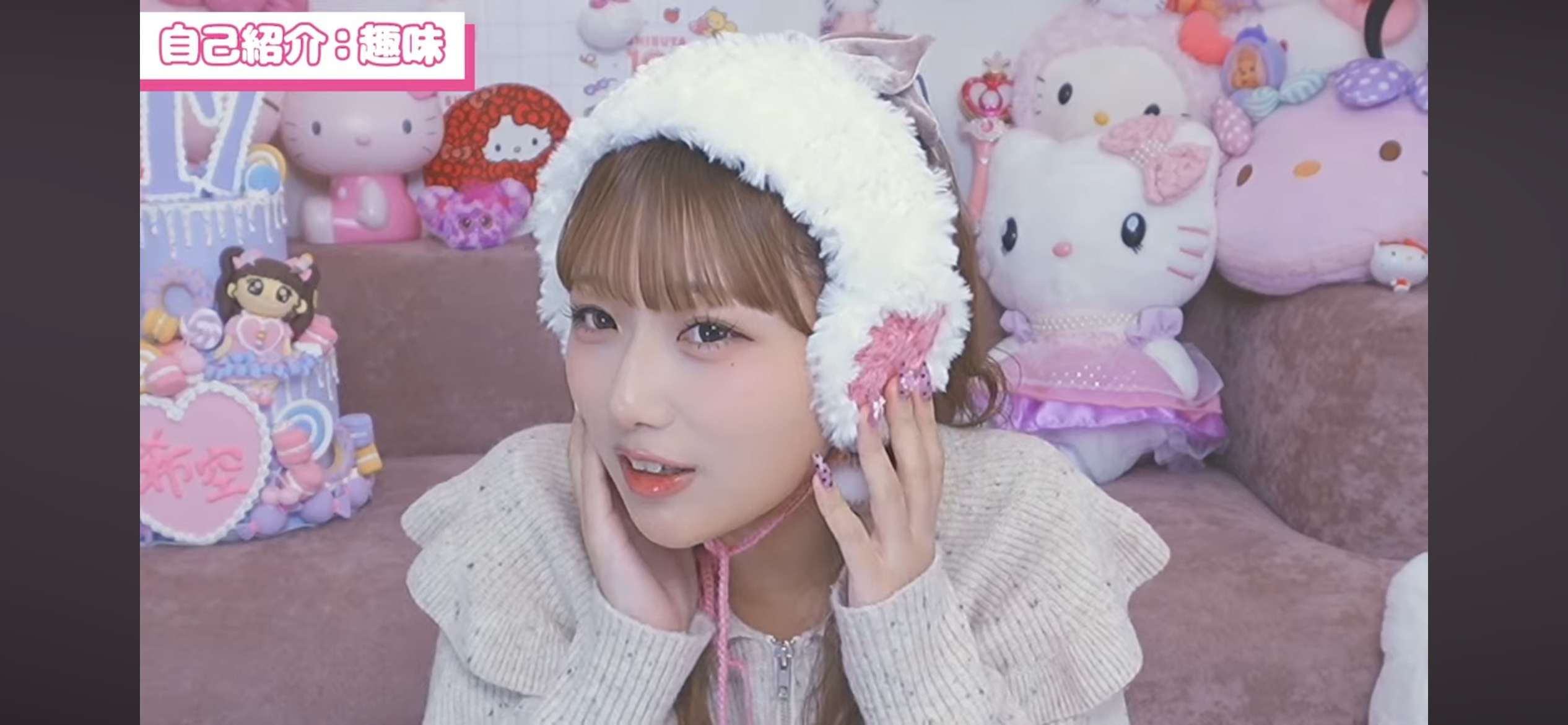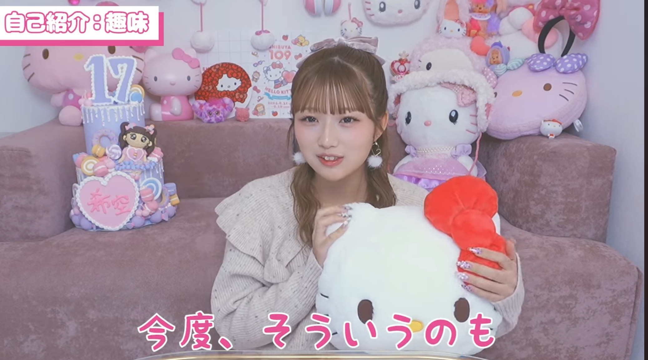 希空ちゃんは大好きなキティちゃんのぬいぐるみや、ピンク色のアイテムで飾られた部屋を紹介し、「ピンクとキティちゃんを集めていたら、めちゃめちゃ派手でかわいくなりました」と語ります。さらに、最近始めた編み物で自作したイヤーマフを見せるなど、女子高校生らしい一面も垣間見せています。